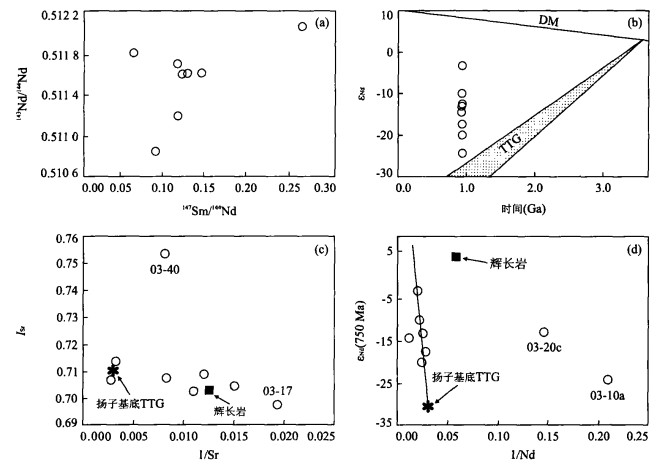 图 2 五莲片麻岩的地球化学成分图解 a.石英(Q)-碱性长石(A)-斜长石(P) 三角分类图解(Le Maitre, 1989); b.A/NK-A/CNK关系图; c. (Nb+Y)-Nb构造环境判别图(Pearce et al., 1984); d.La/Yb~Th/Yb判别图(Condie, 1989); e.稀土元素球粒陨石标准化曲线(球粒陨石数值据Boynton, 1984); f.不相容元素原始地幔标准化蛛网图(原始地幔数值据McDonough and Sun, 1995); 侵入岩系列的演化趋势据Lameyre and Bonin (1991); A.强碱性; B.适度碱性; C.二长质; D.钙碱性.资料来源: 薛怀民等(2005b); 黄洁等(2005) Fig. 2. Geochemical compositions of representative samples from the Wulian gneisses 图 3 五莲新元古代花岗岩类的同位素组成 a.147Sm/144Nd与143Nd/144Nd关系图; b.Nd同位素初始值投影在εNd-时间演化图上(扬子基底TTG演化趋势据Gao et al., 1999); c.Sr同位素初始值与1/Sr关系图; d.Nd同位素初始值与1/Nd关系图.扬子基底TTG片麻岩资料据Gao et al. (1999) Fig. 3. Sr and Nd isotopic compositions of the Neoproterozoic granitoid from Wulian 图 4 五莲新元古代花岗岩类的εNd (750 Ma) 与ISr关系图解 将扬子地台北缘随州地区晚元古代末期的辉长岩(Sr=166 μg/g, ISr=0.704 5, Nd=14.16 μg/g, εNd (750 Ma) =+4.6) 代表地幔组分.2个地壳组分, 地壳1为崆岭地区太古代的TTG片麻岩(Ames et al., 1996; Sr=143 μg/g, ISr=0.708 456, Nd=9.05 μg/g, εNd (750 Ma) =-33.9), 地壳2为韩国的一类地壳组分(Kwon et al., 1999) Fig. 4. εNd (750 Ma) vs. ISr diagram showing mixing correlation between the presumed mantle component and crustal components for the Neoproterozoic granitoid from Wulian 表 1 五莲新元古代花岗岩类的Rb-Sr和Sm-Nd同位素组成 Table 1. Rb-Sr and Sm-Nd isotopic compositions of Neoproterozoic granitoids from Wulian