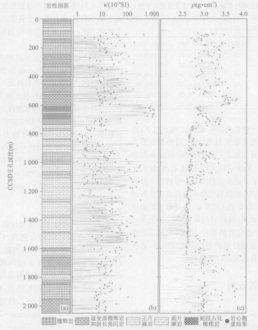 Berckhemer, H., Rauen, A., Winter, H., et al., 1997. Petro physical properties of the 9 km deep crustal section at KTB. J. Geophys. Res., 102(B8): 18337-18362. doi: 10.1029/96JB03396 Emmeimman, R., Lauterjung, J., 1997. The German Continental Deep Drilling Program KTB: Overview and major result. J. Geophys. Res., 102(B8): 18179-18201. doi: 10.1029/96JB03945 Jin, Z.M., Ou, X.G., Xu, H.J., et al., 2004. Elastic wave velocities of the 2 000 m depth at Chinese Continental Scientific Drilling: Constraints on deep seismic reflection. Acta Petrologica Sinica, 20(1): 81-96(in Chinese with English abstract). Kozlovsky, Y. A., 1987. The super-deep well of the Kola peninsula. Spinger, Berlin. Liu, F.L., Xu, Z.Q., Yang, J.S., et al., 2004. Geochemical characteristics and UHP metamorphism of granitic gneisses in the main drilling hole of Chinese Continental Scientific Drilling Project and its adjacent area. Acta Petrologica Sinica, 20(1): 9-26(in Chinese with English abstract). Liu, Q.S., Liu, Q.S., Zhang, Z.M., et al., 2004. Serpentinized peridotite as source of aeromagnetic anomalies. Journal of China University of Geosciences, 15(4): 416-419. Niu, Y.X., Pan, H.P., Wang, W.X., et al., 2004. Geophysical well logging in main hole(0-2 000 m)of Chinese Continental Scientific Drilling. Acta Petrologica Sinica, 20(1): 165-178(in Chinese with English abstract). Ou, X.G., Jin, Z.M., Xia, B., et al., 2005. Correlations between petrophysical properties of ultra-high pressure rocks and its significance on establishing the geophysical interpretation standards for crystalline rocks. Acta Petrologica Sinica, 21(3): 1005-1014(in Chinese with English abstract). Paul, B.T., Jafar, A.H., Stephen, E.H., 1990. The effects of serpentinization on density and magnetic susceptibility: A petrophysical model. Physics of the Earth and Planetary Interiors, 65(1-2): 137-157. doi: 10.1016/0031-9201(90)90082-9 Rauen, A., Soffel, H.C., Winter, H., 2000. Statistical analysis and origin of the magnetic susceptibility of drill cuttings from the 9.1 km deep KTB drill hole. Geophysical Journal International, 142(1): 83-94. Wang, S.B., Zhang, H.T., Shao, Q.Q., et al., 2003. SPSS professional statics. Mechanical Engineering Press, Beijing(in Chinese). Xu, H.J., Jin, Z.M., Ou, X.G., et al., 2004. Effects of retrogression of ultrahigh-pressure eclogites on magnetic susceptibility and anisotropy. Earth Science—Journal of China University of Geosciences, 29(6): 674-684(in Chinese with English abstract). Xu, J., Chen, Y. C., Wang, D. H., et al., 2004. Titanium mineralization in the ultrahigh-pressure metamorphic rocks from Chinese Continental Scientific Drilling 100-2 000 m main hole. Acta Petrologica Sinica, 20(1): 119-126(in Chinese with English abstract). Xu, Z.Q., 2004. The scientific goals and investigation progresses of the Chinese Continental Scientific Drilling Project. Acta Petrologica Sinica, 20(1): 1-8(in Chinese with English abstract). Xu, Z.Q., Yang, W.C., Zhang, Z.M., et al., 1998. Scientific significance and site-selection researches of the first Chinese Continental Scientific Deep Drillhole. Continental Dynamics, 3: 1-13. Yang, W. C., 2002. Geophysical profiling across the Sulu ultrahigh-pressure metamorphic belt, eastern China. Tectonophysics, 354: 277-288. doi: 10.1016/S0040-1951(02)00386-4 You, Z.D., Su, S.G., Liang, F.H., et al., 2004. Petrography and metamorphic deformational history of the ultrahigh-pressure metamorphic rocks from the 100-2 000 m core of Chinese Continental Scientific Drilling, China. Acta Petrologica Sinica, 20(1): 43-52(in Chinese with English abstract). Yu, Q.F., Guo, Y.Z., Meng, X.H., et al., 2002. Petrophysical parameters at Continental Scientific Drilling site in Subei, China. Chinese J. Geophys., 45(1): 93-100(in Chinese with English abstract). Yu, Q.F., Yao, C.L., Meng, X.H., et al., 2001. Interpretation of gravity and magnetic anomalies obtained at Continental Scientific Drilling site in Subei. Chinese J. Geophys., 44(6): 825-832(in Chinese with English abstract). Zhang, R.Y., Liou, J.G., Zheng, Y.F., et al., 2003. Transition of UHP eclogites to gneissic rocks of low amphibolite facies during exhumation: Evidence from the Dabie terrane, central China. Lithos, 70: 269-291. doi: 10.1016/S0024-4937(03)00102-6 Zhang, Z.M., Xu, Z.Q., Liu, F.L., et al., 2002. Composition and metamorphism of the root of the southern Sulu orogen. Geological Bulletin of China, 21(10): 609-616(in Chinese with English abstract). Zhang, Z.M., Xu, Z.Q., Liu, F.L., et al., 2004. Geochemistry of eclogites from the main hole(100-2 050 m)of the Chinese Continental Scientific Drilling Project. Acta Petrologica Sinica, 20(1): 27-42(in Chinese with English abstract). Zhao, P.D., Wei, M., Li, Z.J., et al., 1990. Statistical analysis of geological exploration. China University of Geosciences Press, Wuhan(in Chinese). 金振民, 欧新功, 徐海军, 等, 2004. 中国大陆科学钻探主孔100~ 2 000 m岩石弹性波速度: 对地震深反射的约束. 岩石学报, 20(1): 81-96. https://www.cnki.com.cn/Article/CJFDTOTAL-YSXB200401006.htm 刘福来, 许志琴, 杨经绥, 等, 2004. 中国大陆科学钻探主孔及周边地区花岗质片麻岩的地球化学性质和超高压变质作用的识别. 岩石学报, 20(1): 9-26. https://www.cnki.com.cn/Article/CJFDTOTAL-YSXB200401001.htm 牛一雄, 潘和平, 王文先, 等, 2004. 中国大陆科学钻探主孔(0~ 2 000 m)地球物理测井. 岩石学报, 20(1): 165-178. https://www.cnki.com.cn/Article/CJFDTOTAL-YSXB200401014.htm 欧新功, 金振民, 夏斌, 等, 2005. 超高压变质岩物理性质的相关性对建立结晶岩区地球物理解释标尺的意义. 岩石学报, 21(3): 1005-1014. https://www.cnki.com.cn/Article/CJFDTOTAL-YSXB200503040.htm 王苏斌, 郑海涛, 邵谦谦, 等, 2003. SPSS统计分析. 北京: 机械工业出版社. 徐海军, 金振民, 欧新功, 等, 2004. 超高压榴辉岩退变质作用对岩石磁化率的影响. 地球科学———中国地质