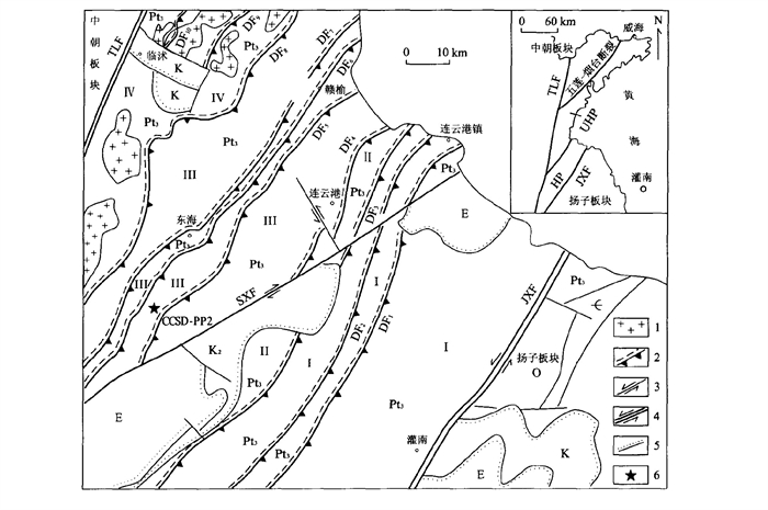1.中生代花岗岩; 2.逆冲型韧性剪切带; 3.走滑断层; 4.大型走滑断层; 5.不整合; 6.CCSD-PP2位置; E.古近系; K.白垩系; O.奥陶系; ⋲.寒武系; Pt3.晚元古代; Ⅰ.南苏鲁高压-低温变质岩剪切构造叠覆岩片; Ⅱ.南苏鲁高压-中温变质剪切叠覆构造岩片; Ⅲ.北苏鲁超高压变质表壳岩构造叠覆岩片; Ⅳ.北苏鲁超高压花岗质变质岩剪切叠覆岩片; DF1-DF10.韧性剪切带编号