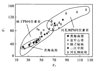 图 2 εNd (t) -ISr同位素相关图(夏林圻等, 2004) 图 3 V1-V2相关图(沈上越等, 2001) Fig. 3. V1-V2 correlogram 表 1 青海南部二叠纪火山岩Sr、Nd同位素成分分析结果 Table 1. Analytic results of Sr and Nd isotope components from Permian volcanic rocks in southern Qinghai   表 2 青海南部二叠纪火山岩Pb同位素分析结果 Table 2. Analytic results of Pb isotope components from Permian volcanic rocks in southern Qinghai