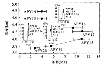 摘要: 对昆仑垭口地区小南川岩体7件样品进行磷灰石裂变径迹年代学测试, 分析了岩体的冷却过程及岩体的剥露与构造地貌演化的关系.结果表明东昆仑山区中新世晚期视剥蚀速率极为缓慢, 为0.020~0.035mm/a, 反映的是构造隆升作用微弱、地貌缓和的地质环境, 因而构造隆升速率与低的视剥蚀速率相当.上新世以来小南川岩体突发性快速隆升冷却, 造成超过3km的物质揭顶, 这不是由单纯的剥蚀过程导致, 而是反映了昆仑山上新世以来的强烈构造隆升驱动下的成山作用过程.岩体上新世的裂变径迹年龄与近东西向的昆仑河-野牛沟谷地断裂断陷、昆仑垭口盆地断陷以及后期西大滩谷地断陷的综合构造地貌演化有密切的成因联系.此外裂变径迹年龄的空间分布格局反映了区域性的差异隆升作用, 由南向北、由西向东, 隆升和剥蚀作用逐渐衰减, 这与东昆仑山南北向以及东、西昆仑山之间地貌发育的差异性以及新生代火山作用分布是吻合的.Abstract: Apatite fission track (AFT) thermochronology of seven samples from the Xiaonanchuan pluton in the Kunlun pass area was carried out to determine the timing of cooling and the relation between the exhumation and the morphotectonic processes. The AFT ages yield low denudation rates of 0.020-0.035 mm/a during the Late Miocene, which correspond to a stable geomorphic and weak tectonic uplifting environment. The low denudation rates can be considered as the approximate tectonic uplifting rates. The AFT geochronology shows paroxysmally rapid cooling since the Pliocene and an apparent material unroofing of more than 3 km in the Xiaonanchuan area. This was not the result of simple denudation. The rapid cooling was coupled with the intensive mountain building processes since the Pliocene, which were driven by tectonic uplifting. The accelerated relief building was accompanied by a series of faulting, which caused the basin and the valley formation and sinking. The space pattern of the AFT ages also shows differential uplifting, which decreases northwardly. This trend is supported by the regional AFT data, which indicate that the exhumation decreases northwardly in eastern Kunlun. This trend also exists in east-west orientation from the western Kunlun range to the eastern. The uplifting trend is also supported by geomorphic characteristics including the elevation and the relief differences as well as the distribution of the Late Cenozoic volcanism.-
