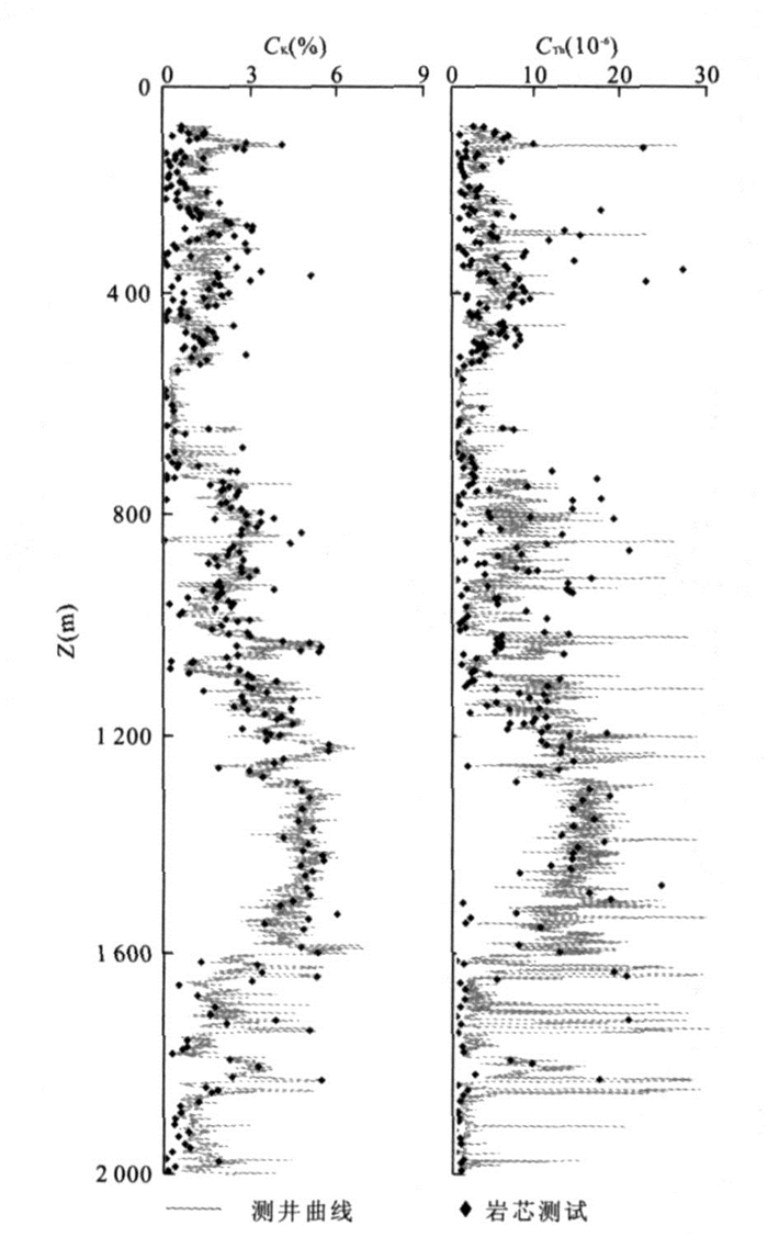 图 2 CCSD主孔100~2 000 m的测井和岩心样品CK, CTh测量结果的对比(岩心测试数据引自曾令森等, 2005)