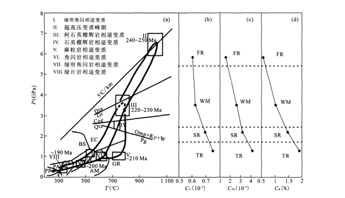 图 4 超高压榴辉岩退变质过程的P-T轨迹及其CU, CTh, CK的变化(图(a) 引自张泽明等(2005))