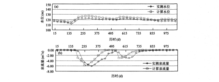 摘要: 为了对黑龙洞泉域水资源进行评价, 通过对地质条件、水位观测资料的深入研究, 以水均衡原理、地下水渗流理论为基础, 建立了黑龙洞泉域地下水渗流数值模型.以灰色序列预测模型为辅助手段, 结合历年的降水规律, 对未来现状开采条件下的年均降水量、地下水流场、水位及泉流量进行了不同保证率条件下的预测, 若2010年为丰水年(保证率20%)、平水年(保证率50%)、枯水年(保证率75%), 黑龙洞泉汛期地下水位标高分别为超过130m、达到130m、低于130m, 汛期泉流量分别为超过10m3/s、7m3/s、5m3/s.计算结果有利于指导黑龙洞泉域地下水资源的管理和开发利用.Abstract: In order to evaluate the water resources of the whole drainage area of HeiLongdong, the pape establishes groundwater seepage model of the whole spring area of HeiLongdong through the in-depth research of geological condition and the date of water level of this area based on water balance theory, groundwater seepage flow theory and Galerkin finite element theory. Moreover, with the assistance of grey series forecasting model and the rule of the annual precipitation, the annual average precipitation, groundwater flow field, groundwater level and spring flow in the future under current exploitation circumstances were forecasted. If 2010 is a high flow year (guarantee ratio 20%), or median flow year (guarantee ratio 50%), or even low flow year (guarantee ratio 75%), the underground water level of HeiLongdong spring in flood season will exceed 130m, or reach 130m, or even below 130m, and the spring flow in flood season will exceed 10m3 /s, 7m3/s, 5m3/s respectively. The result of prediction is of great significance to management and exploitation of water resources in HeiLongdong spring area.