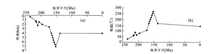 图 3 罗家寨气田罗家7井飞仙关组沉积埋藏史(a) 与热史(b) (黄先平和王世谦, 2002)