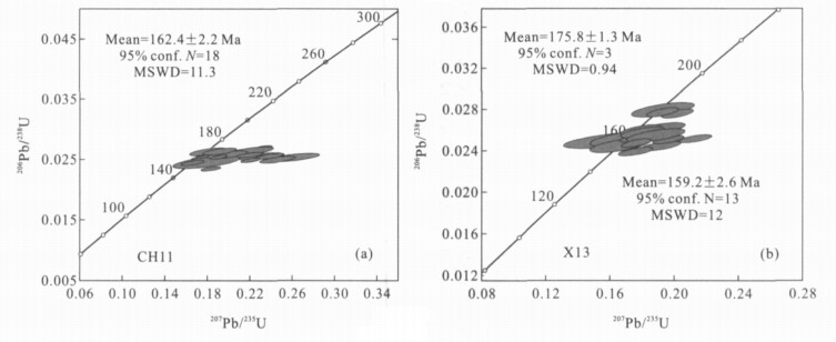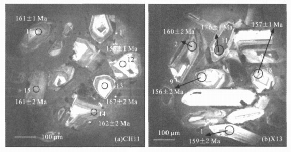 摘要: 为了探讨伊舒地堑与松辽盆地基底的构造演化历史, 对位于伊舒地堑中的2个基底花岗岩进行了锆石LA-ICP-MS U-Pb定年研究, 并与松辽盆地基底花岗岩进行了对比.研究结果表明, 伊舒地堑基底花岗岩中的锆石呈自形或半自形, 并具有典型的岩浆生长环带, 个别发育有核边结构, 锆石的Th/U比值介于0.32 ~ 2.76, 暗示其岩浆成因.CH11井花岗岩中锆石18个测点206Pb/238U加权平均年龄为162±2 Ma, X13井花岗岩中锆石13个测点206Pb/238U加权平均年龄为159 ± 3 Ma, 其核部存在176 ±1 Ma的谐和年龄.上述结果表明, 伊舒地堑中基底花岗岩形成于中侏罗世晚期或晚侏罗世早期, 它们与松辽盆地基底中最晚期花岗岩的形成时间相同.这暗示伊舒地堑与松辽盆地自燕山期以来具有类似的基底演化历史. 176 ±1 Ma继承锆石的存在也证明了上述认识.Abstract: LA-ICP-MS zircon U-Pb dating was carried out for two basement granites from the Yishu graben to compare the tectonic evolutionary history between the Yishu graben and Songliao basin. The results indicate that most of zircons from the basement granites are euhedral to subhedral in shape and show the typical oscillatory zoning with magmatic origin, some of which display the core-rim structure. Their Th/U ratios range from 0.32 to 2.76, implying that they should be from crystallization of magma. The dating results indicate that a weighted mean 206pb/238U age is 162±2 Ma for the basement granite from CHll well (sample No. CHll), and that weighted mean 206Pb/238U ages are 159±3 Ma and 176± 1 Ma for rims and cores of zircons from the granite in X13 well (sample No. X13), respectively. It is suggested that the basement granites were formed in late stage of the Middle Jurassic or the beginning of the Late Jurassic, which is consistent with ones of the latest basement granites from the Songliao basin. Therefore, it is proposed that the Yishu graben displays similar evolutionary history with the Songliao basin since the Yanshannian movement, which is also proved by the occurrence of the inherited zircons with age of 176±1 Ma.