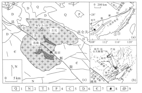图 1 西南丹一昆仑关地区大地构造位置图(a)、广西构造略图(b)及昆仑关岩体地质图(c)