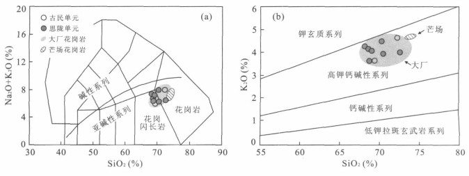 碱性与亚碱性系列划分曲线据Irvine and Baragar(1971);岩系划分据Peccerillo and Taylor(1976);南丹地区大厂(6个样品)和芒场(2个样品)矿田同时代黑云母花岗岩阴影投影范围据蔡明海等(2004)确定