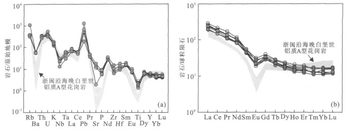 原始地幔和球粒陨石标准据Sun and McDonough(1989);浙闽沿海晚白垩世铝质A型花岗岩椐邱检生等(1999, 2000),共11个样品点;图例同图 2。下同