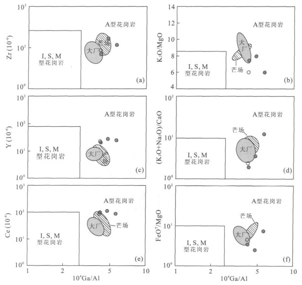 S、I、M与A型花岗岩划分据Whalen et al.(1987);南丹地区大厂(4个样品)和芒场(4个样品)矿田花岗岩数据据蔡明海等(2004)