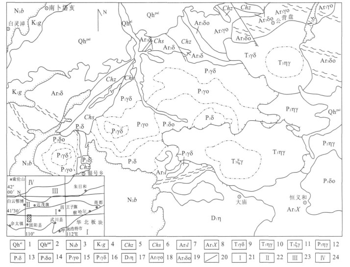 1.第四系冲积物; 2.第四系洪积物; 3.新近系宝格达乌拉组; 4.白垩系固阳组; 5.渣尔泰山群增隆昌组; 6.渣尔泰山群书记沟组; 7.新太古界色尔腾山岩群柳树沟岩组; 8.古太古界兴和岩群; 9.晚三叠世花岗闪长岩; 10.晚三叠世二长花岗岩; 11.晚三叠世二长花岗岩; 12.晚二叠世二长花岗岩; 13.早二叠世闪长岩; 14.早二叠世石英闪长岩; 15.早二叠世英云闪长岩; 16.早二叠世花岗闪长岩; 17.早泥盆世角闪二长岩; 18.新太古界片麻状英云闪长岩; 19.新太古代片麻状石英闪长岩; 20.区域性断裂; 21.华北板块北缘; 22.白云鄂博凹陷带; 23.包尔汗-温都尔庙褶皱带; 24.索伦山-西拉木伦河褶皱带断裂
