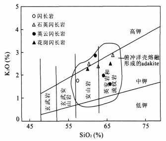 表 1 固阳地区埃达克质花岗岩的主量元素(%)、微量和稀土元素(10-6) 分析及有关参数