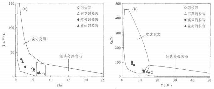 图 4 固阳地区花岗岩类的(La/Yb)v-Yb、和Sr/Y-Y图解(肖庆辉等, 2002)