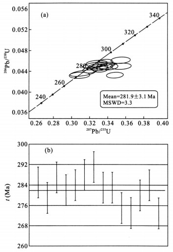 摘要: 内蒙古固阳地区西营子花岗岩体属于钙碱性系列, 具有岛弧花岗岩的特征.其岩石地球化学具有与adakite岩相似的特征.这些岩石的SiO2含量均大于56 (57.28~66.63), Al2O3含量均大于15 (15.93~18.04), MgO含量为1.14~3.47, 富钠、贫钾, Na2O/K2O在1.16~1.97之间, Sr含量高(446~582μg/g), 均大于400μg/g, Sr/Y比值为31.32~103.74, 大于20~40, 低Y (5.61~17.4μg/g, 小于18μg/g)和Yb (0.42~2.06μg/g, 仅1个样品大于1.9μg/g), 具弱Eu正异常, 无明显的Eu负异常; 稀土元素分异强烈, 属轻稀土元素富集型; Sr具明显的正异常而Nb的负异常亦较为明显.利用激光等离子体质谱仪(LA-ICP-MS) 对固阳地区埃达克质花岗岩中的锆石进行了U-Pb定年, 其同位素年龄为281.9±3.1Ma (MSWD=3.3), 形成于早二叠世.该地区埃达克岩的发现, 为古亚洲洋的闭合时限提供了新的线索, 对研究中亚造山带晚古生代构造演化、地球动力学特征具有十分重要的意义, 为解决内蒙古及古亚洲洋研究中长期争论的地质问题提供了年代学和地球化学制约.Abstract: Xiyingzi granite-body in Guyang area, Inner Mongolia, belongs to calc-alkaline series, bearing the characteristics of island arc affinity.Its petrological geochemistry characteristics are almost similar to those of adakite: SiO2 content > 56% on average (57.28%-66.63%); Al2O3 > 15% (15.93%-18.04%); MgO=1.14%-3.47%, enriched in Na and depleted in K; Na2O/K2O=1.16-1.97;Sr content (446-582 μg/g) > 400 μg/g on average and Sr/Y ratio =31.32-103.74, > 20-40;low Y content (5.61-17.4 μg/g, less than 18 μg/g); low Yb (0.42-2.06 μg/g, only one sample's Yb content > 1.9 μg/g); with small positive Eu anomaly and without significantly negative Eu anomaly; REE has a strong differentiation, which belongs to the strong LREE enrichment type; Sr has obvious positive anomaly, while Nb has significant negative anomaly.The laser-plasma mass spectrometry (LA-ICP-MS) was used for the zircon U-Pb dating of adakitic granite in Guyang area and the isotope age was obtained to be 281.9±3.1 Ma (MSWD=3.3), indicating an Early Permian activity.The discovery of adakite in this region provides new clues on the closure time of Paleo-Asian Ocean, and is of great significance to the study of Central Asia Late Paleozoic orogenic belt's tectonic evolution and geodynamics characteristics.It also provides geological and geochemical constraints on resolving the long-term debates on the Inner Mongolia and Paleo-Asian Ocean.