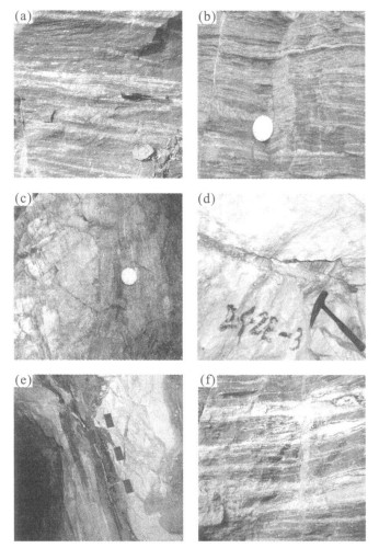 a.片岩, N26°55’11.5”, E117°00’01.6”; b.变粒岩。N27°27’11.6”, Ell8°21’48.2”; c大理岩, N26°50’23.6”E118°23’42.3”; d.条带状含磁铁石英岩, N27°51’02.1”, E118°58’38.6”, 己大理岩与变粒岩呈互层状产出, N26°50’23.6”, Ell8°23’42.3”; L片岩夹石英脉和伟晶岩脉, 沿裂隙发生绿帘石化现象。N26°55’11.5”, E117°00’01.6, ,