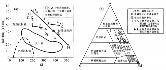 图 3 )龙泉群、马面山群和万全群变沉积岩西蒙南图解(Simonen, 1953), 其中坐标值为Niggli值; (b)A-C-FM判别图解(谢缅年科, 1966, 转引自王仁民等, 1987)