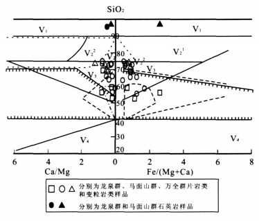 图 4 泉群、马面山群和万全群变沉积岩SiO2-Ca/Mg和SiO2-Fe/(Ca+Mg)图解(CaO≤5%)(据米什金, 1981, 转王仁民等, 1987)