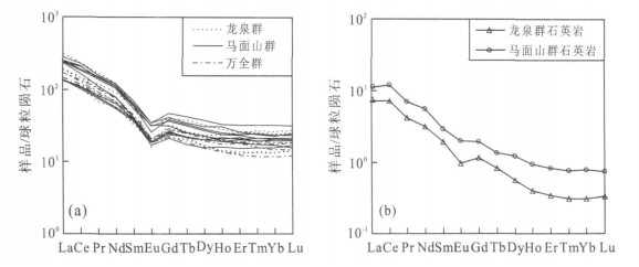 图 5 龙泉群、马面山群和万全群变沉积岩稀土元素球粒陨石标准化曲线(球粒陨石REE含量引自Sun and McDonough, 1989)