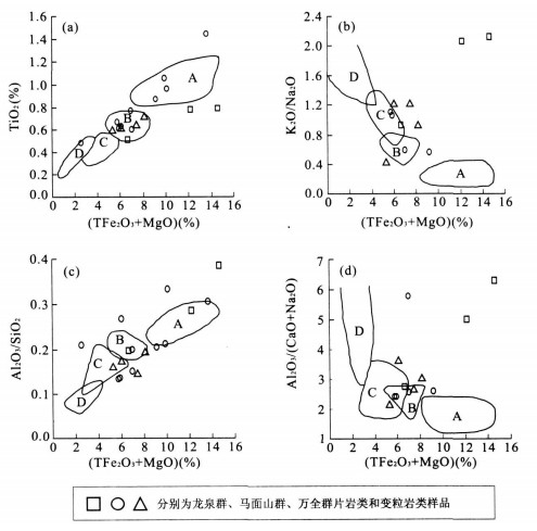 图 6 龙泉群、马面山群、万全群片岩类和变粒岩类主量元素相关性图解(Bhatia, 1983)