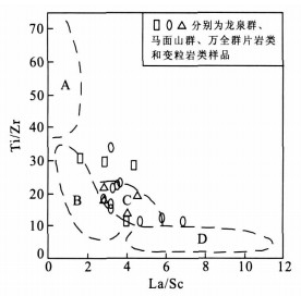 图 7 龙泉群、马面山群和万全群片岩类和变粒岩类La/Se-Ti/Zr图解(A、B、C、D图例同图 6)