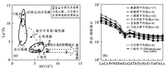 Fig. 8. (a)Diagram of Hf-La/Th for schists and leptynites of the Longquan, Mamianshan, and Wanquan groups; (b)Comparative diagrams of chondrite-normalized REE patterns for Precarnbrian metamorphic basement rocks of the Cathaysia block in Zhejiang and Fujian Provinces