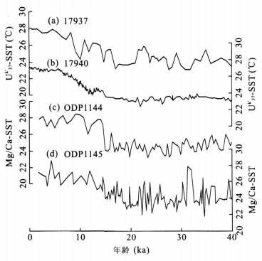 摘要: 以分子有机地球化学为手段对南海北部四万年来的古环境古气候研究表明, U37k’-SST表层水温在冰期、间冰期平均范围分别为27℃和24℃, LGM与全新世温差达4.5℃; 以高分子量烷烃所代表的陆源物质输入和长链不饱和酮化合物所代表的海洋初级生产力都呈现冰期高、间冰期低特征, 表明冰期时陆源物质输入的增加和海洋表层生产力的提高; 正构烷烃C31/C27记录了南方大陆的植被由冰期时草本植物占优势向间冰期时木本植物占优势的转变.说明南海在末次冰期以来气候的不稳定性, 和海陆生态系统对气候变化的响应以及分子有机地球化学在古环境古气候研究中的巨大潜力.Abstract: Molecular organic geochemical analysis of Core 17937 in the northern South China Sea has provided useful information on the paleoenvironmental change in the 40 ka and revealed that the average surface temperature of U37k'-SSTs in glacial and interglacial is 27 ℃ and 24 ℃ respectively, resulting in a difference of 4.5 ℃ between Holocene and LGM.The terrestrial input, mainly consisting of high molecular weight alkanes and marine primary productivity, constituting long chain alkenones, both exhibited a high value in glacial and low value in interglacial, which suggests the supply of organic matter from the land is enhanced and the productivity in the ocean during glacial is increased.Alkane ratio of C31/C27 indicated that the predominant plants in South China changed from grass during glacial to tree during interglacial.All the results show the instability of climate since the last glacial in the SCS, and the significant role played by marine and terrestrial ecosystems in climate changes, as well as the potential of molecular organic geochemistry in paleoenvironment and paleoclimate studies.