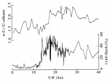 图 5 17937岩心正构烷烃C31/C27变化曲线与1144站孢粉含量的对比(Sun et al., 2003)