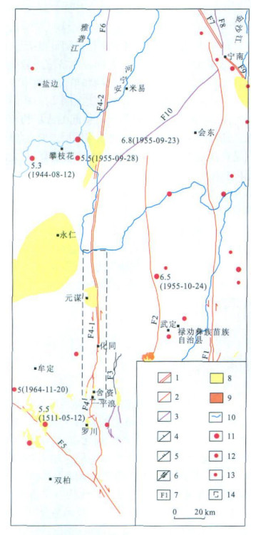 Deng, Q. D., Wang, Y. P., Liao, Y. H., et al., 1984. Colluvial wedges of fault scarp and history of faulting on the Helan Shan piedmont fault. Chinese Science Bulletin, 9: 557-560 (in Chinese). Ding, G. Y., 1995. The segmentation model of active fault. Earth Science Frontiers, 2 (1-2): 195-202 (in Chinese with English abstract). Kang, L. X., 1991. Discussion on the basic characteristics and formation mechanism of the south-north seismic zone in China. Crustal Deformation and Earthquake, 11 (4): 76-85 (in Chinese with English abstract). Li, Q. C., Jiang, F. C., Qian, F., 1993. Sedimentary facies and environmental evolution of the Yuanmou basin in late Cenozoic. Geography and Geo-Information Science, 9 (3): 30-36 (in Chinese). Li, X. G., 2003. Generality on Neotectonic movement of China. Earthquake Publishing House, Beijing, 1-42 (in Chinese). Lu, H. F., Ma, B. Q., Liu, G. X., 2006. Characteristics of the Neotectonic movement of the NEE-striking fault belt north of Wen County, Gansu. Journal of Seismological Research, 29 (2): 143-146 (in Chinese with English abstract). Nur, A., Ron, H., Scotti, O., 1989. Kinematics and mechanics of tectonic block rotations. Geophysical Monograph, 49/IUGG Series, 4: 31-46. Ran, Y. K., Deng, Q. D., 1999. History, status and trend of the research of pal-seismology. Chinese Science Bulletin, 44 (1): 12-20 (in Chinese). doi: 10.1360/csb1999-44-1-12 Shen, X. H., Wang, Y. P., 2001. Pilot study on the basic characteristics of the latest structural deformation in Sichuan-Yunnan area. Earthquake Publishing House, Beijing, 430-439 (in Chinese). Xie, F. R., Zhu, J. Z., Liang, H. Q., et al., 1993. Basic characteristics of recent tectonic stress field in Chinese southwestern area. Acta Seismologica Sinica, 15 (4): 407-417 (in Chinese). Xiong, X., Wang, J. Y., Teng, J. W., 2007. Deep mechanical background for the Cenozoic volcanism in the Tibetan plateau. Earth Science—Journal of China University of Geosciences, 32 (1): 1-6 (in Chinese with English abstract). Xu, X. W., Wen, X. Z., Zheng, R. Z., et al., 2003. The newest way and force source of active block in Sichuan-Yunnan area. Science in China (Ser. D), 33 (Suppl. ): 151-162 (in Chinese). Yao, H. T., Deng, C. L., Lv, L. Q., 2005. A review of magnetostratigraphic studies of the Yuanmou sequences. Progress in Geophysics, 20 (2): 518-523 (in Chinese with English abstract). Zhang, S. T., Xu, Z. Z., 1994. Relation of the regional structure framework and its evolution law to geologic hot events in Ninglang area. Journal of Chengdu Institute of Technology, 21 (4): 17-21 (in Chinese with English abstract). Zhang, X., Jiang, Z. S., Wang, S. X., 2004. Negative dislocation model for synthetic solution of GPS observation of south-north seismic zone during 1999-2001. Earthquake Research in Plateau, 16 (1): 26-34 (in Chinese with English abstract). Zhao, C. P., Cai, J. G., Ling, Y. L., et al., 2003.6. 5 grade earthquake happing in Wuding of Yunnan Province on October, 24th, 1995. In: The Shared Data Centre of National Seismic Science. Earthquake Bureau of Yunnan Province, Kunming. 邓起东, 汪一鹏, 廖玉华, 等, 1984. 断层崖崩积楔及贺兰山山前断裂全新世活动历史. 科学通报, 9: 557-560. https://www.cnki.com.cn/Article/CJFDTOTAL-KXTB198409013.htm 丁国瑜, 1995. 活断层的分段模型. 地学前缘, 2 (1-2): 195-202. https://www.cnki.com.cn/Article/CJFDTOTAL-DXQY502.014.htm 康来迅, 1991. 中国南北地震带的基本特征及其形成机理之探讨. 地壳形变与地震, 11 (4): 76-85. https://www.cnki.com.cn/Article/CJFDTOTAL-DKXB199104011.htm 李庆辰, 蒋复初, 钱方, 1993. 元谋盆地晚新生代沉积相与环境演变. 地理与地理信息科学, 9 (3): 30-36. https://www.cnki.com.cn/Article/CJFDTOTAL-DLGT199303007.htm 李祥根, 2003. 中国新构造运动概论. 北京: 地震出版社, 1-42. 卢海峰, 马保起, 刘光勋, 2006. 甘肃文县北部北东东向断裂带新构造活动特征. 地震研究, 29 (2): 143-146. https://www.cnki.com.cn/Article/CJFDTOTAL-DZYJ200602007.htm 冉勇康, 邓起东, 1999. 古地震学研究的历史、现状和发展趋势. 科学通报, 44 (1): 12-20. https://www.cnki.com.cn/Article/CJFDTOTAL-KXTB199901002.htm 申旭辉, 汪一鹏, 2001. 川滇地区最新构造变形基本特征初步研究. 北京: 地震出版社, 430-439. 谢富仁, 祝景忠, 梁海庆, 等, 1993. 中国西南地区现代构造应力场基本特征. 地震学报, 15 (4): 407-417. https://www.cnki.com.cn/Article/CJFDTOTAL-DZXB199304001.htm 熊熊, 王继业, 滕吉文, 2007. 青藏高原新生代火山活动的深部力学背景. 地球科学——中国地质大学学报, 32 (1): 1-6. https://www.cnki.com.cn/Article/CJFDTOTAL-DQKX200701000.htm 徐锡伟, 闻学泽, 郑荣章, 等, 2003. 川滇地区活动块体最新构造变动样式及其动力来源. 中国科学(D辑), 33 (增刊): 151-162. https://www.cnki.com.cn/Article/CJFDTOTAL-JDXK2003S1016.htm 姚海涛, 邓成龙, 吕连清, 2005. 元谋盆地河湖相沉积物磁性地层学研究综述. 地球物理学进展, 20 (2): 518-523. https://www.cnki.com.cn/Article/CJFDTOTAL-DQWJ200502049.htm 张寿庭, 徐旃章, 1994. 云南宁蒗地区区域构造格局及其演化规律与地质热事件. 成都理工学院学报, 21 (4): 17-21. https://www.cnki.com.cn/Article/CJFDTOTAL-CDLG404.003.htm 张希, 江在森, 王双绪, 2004.1999-2001年南北地震带GPS综合观测解的负位错模型. 高原地震, 16 (1): 26-34. https://www.cnki.com.cn/Article/CJFDTOTAL-GYDZ200401004.htm 赵慈平, 蔡静观, 李永莉, 等, 2003.1995年10月24日云南省武定6.5级地震. 见: 国家地震科学数据共享中心. 昆明: 云南省地震局. -