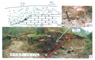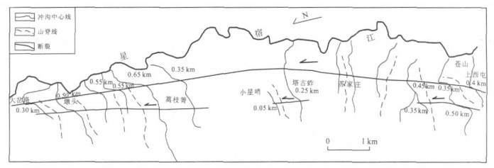 摘要: ETM影像揭示了元谋断裂以左行剪切走滑为主, 局部张剪或压剪的性质.利用1:5万地形图和影像图内冲沟、山脊等地貌位错估测了元谋断裂一平浪-江边段晚第四纪活动性, 详细调查实测并分析了研究区断错地貌和构造剖面, 获取的该断裂晚第四纪活动性、活动强度, 与估测结果一致.结果显示, 元谋断裂一平浪-江边(金沙江边) 段最新活动时间为晚更新世末期-全新世; 其中一平浪-大龙潭一带, 水平滑动速率约2.0mm/a, 垂直滑动速率为0.07mm/a; 木莲旧-秧田井一带, 水平滑动速率接近0.53mm/a, 垂直滑动速率为0.06mm/a; 乐胜古-江边一带, 水平滑动速率接近1.32mm/a, 垂直滑动速率为0.03mm/a.综合分析表明, 该段断裂晚第四纪平均水平滑动速率为1~2.0mm/a, 以走滑运动为主.Abstract: ETM data reveal that the Yuanmou fault is mainly characterized by horizontal left-lateral and shear strike-slip, including ringent shear and pressed shear in part.Taking the advantage of the level moving and offset of the gullies and ridges in 1∶50000 landform and ETM image, we estimated the activity of Yuanmou fault of Yipinglang-Jiangbian segment in the Late Quaternary, and later the results from field exploration, including the analysis of the profiles of landform offsets such as gullies and fluvial landforms, the sections of the active structures in the studied area and activity and active intensity in the Yuanmou fault is the same as what we presumed before.The result shows that the latest active time of the Yuanmou fault of Yipinglang-Jiangbian segment is from the mid-late of Late Pleistocene to Holocene.During these ages, the level moving velocity of left-lateral strike-slip of Yipinglang-Dalongtan segment is approximately 2.0 mm/a, the velocity of uprightness strike-slip approximately 0.07 mm/a.While the respective velocity of left-lateral strike-slip and uprightness strike-slip is approximately 0.53 mm/a and approximately 0.06 mm/a from Yangtianjing to Mulianjiu, the respective velocity of left-lateral strike-slip and uprightness strike-slip approximately 1.32 mm/a and 0.03 mm/a from Leshenggu to Jiangbian.Comprehensive analysis indicates that the level moving velocity since the Late Quaternary in the studied phase is 1~2.0 mm/a, with a major left-lateral shear strike-slip.