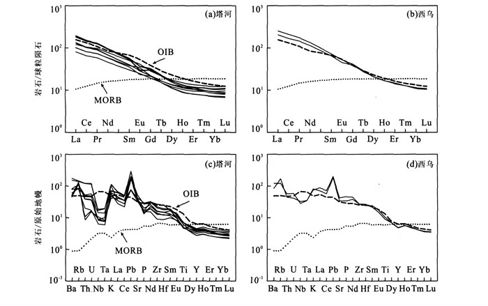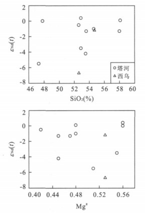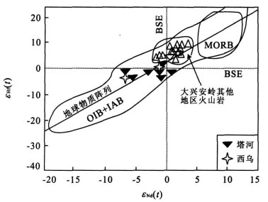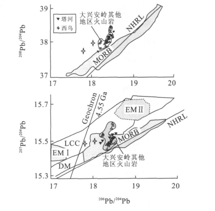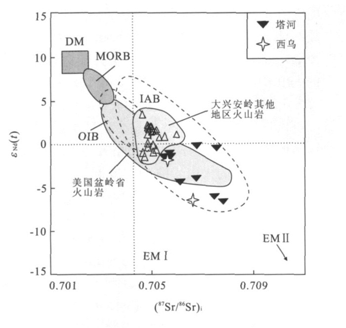 图 火山岩稀土元素球粒陨石标准化和微量元素原始地幔标准化图 球粒陨石标准值采用Anders and Grevesse (1989), 原始地幔标准值采用Sun and McDonough (1989) Fig. . Chondrite normalized rare earth elements patterns and primitive mantle normalized trace elements diagrams of the volcanic rocks 图 大兴安岭中生代火山岩Sr-Nd同位素相关图 大兴安岭其他地区火山岩据Zhang et al. (2008) Fig. . Correlation diagram between the Sr and Nd isotopes for the volcanic rocks 图 大兴安岭中生代火山岩Pb同位素相关图 大兴安岭其他地区火山岩据Zhang et al. (2008) Fig. . The Pb isotopes of the Mesozoic volcanic rocks in Great Xing’an range 图 6 大兴安岭地区中生代火山岩的Nd-Hf同位素相关图 大兴安岭其他地区火山岩据Zhang et al. (2008) Fig. 6. Correlation diagram between the Nd and Hf isotopes for the Mesozoic volcanic rocks in Great Xing'an range 图 9 Nd亏损地幔模式年龄直方图 东北其他地区据Zhang et al. (2008), 华北北缘据周新华等(2001) Fig. 9. Histogram of TDM for the volcanic rocks 表 1 大兴安岭塔河、西乌等地区中生代火山岩的主量、微量元素和Sr-Nd-Pb-Hf同位素组成 Table 1. The major, trace elements and Sr, Nd, Pb and Hf isotopic compositions of Tahe and Xiwu volcanic rocks