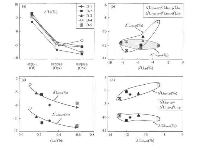 图 1 不同储源的锂同位素组成 数据来源: 海水(You and Chan, 1996; Chan and Edmond, 1988; Moriguti and Nakamura, 1998b; Tomascak et al., 1999b; James and Palmer, 2000); 河水(Huh et al., 1998); 高温孔隙流体(Foustoukos et al., 2004; Kisakürek et al., 2004); 岛弧熔岩(Moriguti and Nakamura, 1998a; Tomascak et al., 2000, 2002; Chan et al., 2002b); 洋岛玄武岩(Tomascak et al., 1999b; Chan and Frey, 2003); 新鲜玄武岩(Chan et al., 1992, 2002b; Moriguti and Nakamura, 1998a; Tomascak and Langmuir, 1999); 蚀变玄武岩(Chan et al., 1992, 2002a); 海洋沉积物(Chan et al., 1994a; Zhang et al., 1998; James et al., 1999; Chan and Kastner, 2000); 黄土、页岩和大陆上地壳(Teng et al., 2004); 榴辉岩(Zack et al., 2003; Marschall et al., 2007); 橄榄岩和辉石岩捕虏体(Tang et al., 2007b); 其他数据来源(Tomascak, 2004) Fig. 1. Li isotopic composition of different reservoirs 图 2 锂同位素的地球化学行为示意图(据Tang et al., 2007b修改) 地表风化作用使得河水具有高的7Li, 河水将高7Li组分补给海洋, 低温洋底蚀变作用使海水的锂同位素组成进一步变重.来自俯冲板片的流体及蛇纹岩底辟块(均高δ7Li) 的重锂同位素特征说明在蚀变洋壳脱水过程中发生了锂同位素分馏.由于俯冲板片释放的流体具有高δ7Li的特征, 它们上升并交代上覆地幔楔, 从而使地幔楔具有重的锂同位素组成.因此, 一些岛弧熔岩具有高δ7Li的特征 Fig. 2. Schematic illustration of Li isotope geochemical behaviors 图 3 橄榄石、单斜辉石和斜方辉石中δ7Li的变化(a), Δ7LiCpx-Ol和Δ7LiOpx-Ol随δ7LiCpx的变化(b), δ7LiCpx和Δ7LiCpx-Ol随单斜辉石的(La/Yb) N的变化(c), δ7LiOpx-Ol和Δ7LiCpx-Opx随Δ7LiCpx-Ol的变化(d) 图(a) 和数据来自Tang et al. (2007a) Fig. 3. Plots showing the variations in δ7Li between olivine, Cpx, and Opx (a), Δ7LiCpx-Ol and Δ7LiOpx-Ol versus δ7LiCpx (b), δ7LiCpx and Δ7LiCpx-Ol versus (La/Yb) N ratios in Cpx (c), and δ7LiOpx-Ol and Δ7LiCpx-Opx versus Δ7LiCpx-Ol (d) 图 4 扩散模型计算结果(model曲线) 与汉诺坝橄榄岩中矿物Li-δ7Li的对比(a), 橄榄石、斜方辉石和单斜辉石的δ7Li随扩散距离的变化(b), 模拟计算的Δ7LiCpx-Ol和Δ7LiOpx-Ol随扩散距离的变化(c), 计算结果与实测的Δ7LiCpx-Ol和Δ7LiOpx-Ol的对比(d) Model 1和model 2分别代表两种不同组成的熔体, 它们代表MORB的变化范围(Moriguti and Nakamura, 1998a).计算参数见表 1 Fig. 4. Diffusion model calculations (model curves) compared to data for Li andδ7Li of minerals in Hannuoba peridotites (a), δ7Li of Ol, Opx and Cpx versus distance from the contact for melt diffusion model (b), Δ7LiCpx-Ol and Δ7LiOpx-Ol versus distance from the contact (c), and Δ7LiCpx-Ol versus Δ7LiOpx-Ol in the diffusion calculations compared to data measured (c) 图 6 汉诺坝橄榄岩中矿物的锂含量和同位素组成以及瑞利蒸馏和同位素二端元混合模型 图中的百分数表示蚀变洋壳脱水的百分比.二端元混合模型参数: 端元1 (熔体) 锂含量为11.5×10-6, δ7Li=-15‰, 端元2 (矿物) 与图 4相同 Fig. 6. Diagram of Li versus δ7Li for minerals in Hannuoba peridotites, and Rayleigh distillation model and two end-member mixing model 表 1 扩散模型计算所采用的参数 Table 1. Parameters used in diffusion model