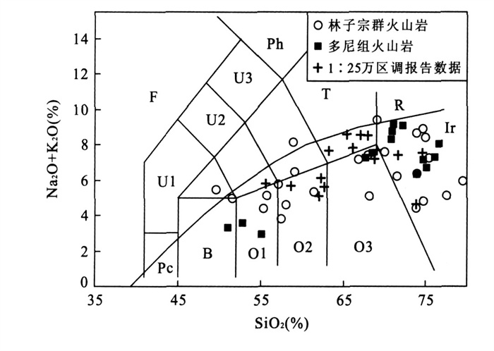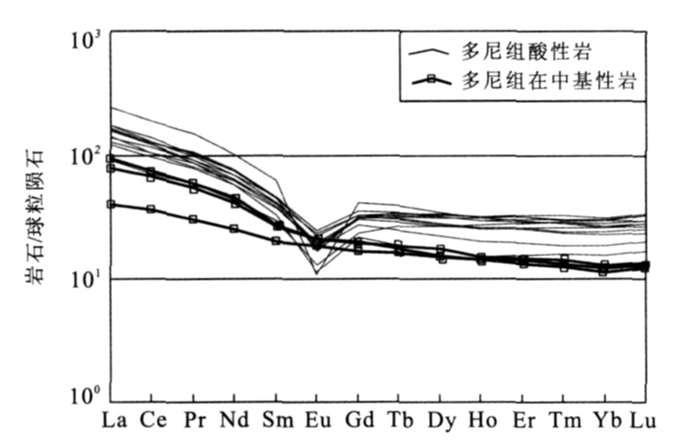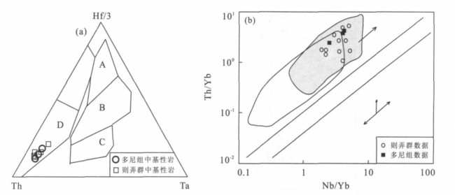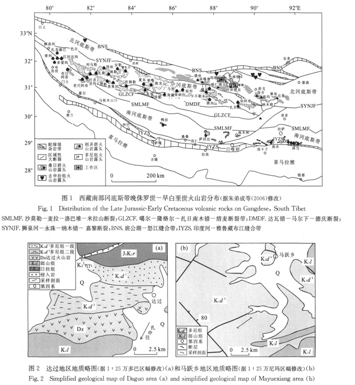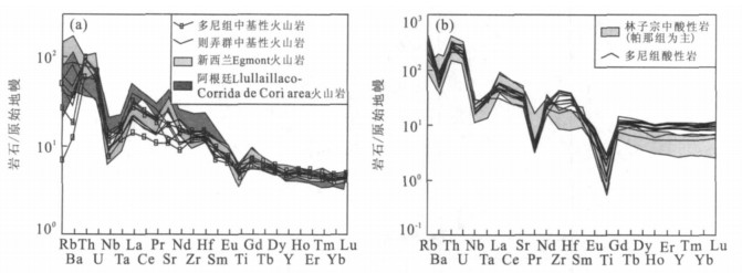 图 1 西藏南部冈底斯带晚侏罗世一早白垩世火山岩分布(据朱弟成等, 2006修改) SMLMF.沙莫勒一麦拉一洛巴堆一米拉山断裂; GLZCF.噶尔一隆格尔一扎日南木错一措麦断裂带; DMDF.达瓦错一马尔下一德庆断裂; SYNJF.狮泉河一永珠一纳木错一嘉黎断裂; BNS.班公湖一怒江缝合带; IYZS.印度河一雅鲁藏布江缝合带 Fig. 1. Distribution of the Late Jurassic-Early Cretaceous volcanic rocks on Gangdese, South Tibet 图 5 多尼组火山岩TAS分类图解(林子宗群火山岩数据来源于Mo et al. (2007, 2008) Fig. 5. TAS diagram of volcanic rocks in Duoni Formation 图 6 多尼组火山岩的SiO2-K2O判别图解(a) 和Na2O-K2O判别图解(b) (数据来源同图 5) Fig. 6. Diagrams of SiO2 vs K2O (a) and Na2O vs K2O (b) of volcanic rocks in Duoni Formation 图 9 多尼组中基性(a)和酸性(b)火山岩原始地幔标准化微量元素蛛网图 新西兰Fgmont火山岩数据来源于Price et al., 1999; 阿根廷LJullallaco-Corrida de Cori area火山岩来源于Richards and Villeneuve(2002); 则弄群数据来源于康志强等, 2008; 林子宗火山岩数据来源于Mo et al. (2007, 2008) Fig. 9. Primitive mantle-normalized spidergrams for intermediate-basic (a) and acid (b) volcanic rocks of Duoni Formation respetively 图 10 多尼组基性火山岩的Th-Ta-Hf(a)(则弄群数据来源同图 9)和判别图解Th/Yb-Nb/Yb(b)(据Pearce and Peate(1995), 则弄群数据来源于朱弟成等, 2006) Fig. 10. Th-Ta-Hf (a) and Th/Yb vs Nb/Yb(b) diagrams for mafic lavas of the volcanic rocks in Duoni Formation 表 1 样品06DN04锆石LA-ICP-MS测年结果 Table 1. LA-ICPMS dating data of zircons in sample 06DNO4   表 2 样品06DN14锆石LA-ICP-MS测年结果 Table 2. LA-ICP-MS dating data of zircons in sample 06DN14   表 3 多尼组火山岩的主量(%).微量元素(10-6)分析测试结果 Table 3. Composition of major (%) and trace elements (10-6) for volcanic rocks of Duoni Formation   表 4 多尼组中基性火山岩与其他地区中基性火山岩在微量元素(10-6) 的对比 Table 4. Comparison between trace elements (10-6) of basic volcanic rocks from Duoni Formation and from some else areas