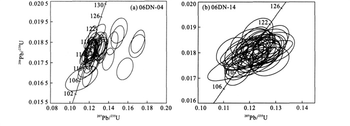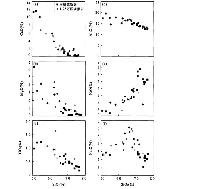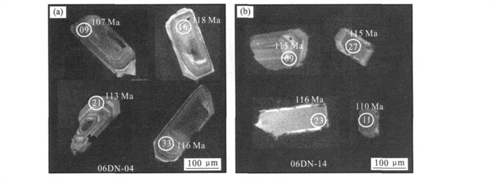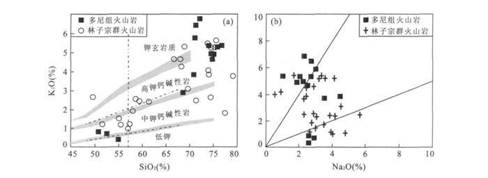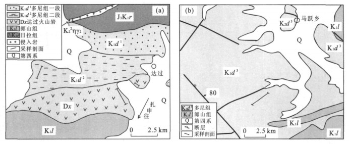 摘要: 拉萨地块上广泛分布有中生代的岩浆活动, 研究它们对于认识特提斯构造域的演化和理解整个青藏高原的形成过程有着重要的启示.对出露于拉萨地块北部的白垩纪多尼组火山岩进行了系统的年代学以及元素地球化学研究, 达过和马跃乡地区的多尼组火山岩主体为酸性岩, 包括少量的玄武岩和玄武安山岩(中基性岩).火山岩的地球化学组成表明多尼组中基性岩具有高的Cr (平均为184×10-6) 和Ni (平均为43×10-6), 富集强不相容性元素Rb、Th、U, 而亏损Nb、Ta、Ti的特点, 显示明显的弧火山岩成分特征, 可能来源于具有较厚陆壳背境下的大陆边缘地幔楔的部分熔融; 而酸性岩具有相对高的SiO2、K2O、K2O/Na2O以及低的Mg# (最大值为32.4), 富集大离子亲石元素Rb、Ba以及Th、U、LREE等, 具有很高的Rb/Sr (1.06~4.47, 平均为2.73), 并且与拉萨地块南部林子宗群酸性火山岩具有非常相似的蛛网图曲线, 表明多尼组酸性岩与中基性岩可能来自不同的岩浆源区, 前者很可能来源于上覆地壳的部分熔融.通过对两个酸性岩样品中锆石的U-PbLA-ICPMS定年, 分别获得了116±1Ma和115±1Ma的年龄值, 显示多尼组火山岩形成于早白垩世中期.该地区多尼组火山岩形成的构造环境仍然存在两种可能性, 其一是新特提斯班公湖-怒江洋岩石圈向南俯冲导致了该火山岩的产生; 其二可能是早白垩世该地段的构造伸展作用导致加厚地壳的广泛部分熔融形成酸性火山岩, 并伴随陆下地幔的熔融事件产生的少量中基性火山岩.Abstract: It can better understand the geological evolution of the Tethys and construction of the whole Tibet plateau through studying Mesozoic volcanic rocks widely exposed in Lhasa block.In present study, we report new major trace of elemental compositions and zircon U-Pb dating results of the Duoni Formation volcanic rocks in north Lhasa block.Duoni Formation volcanic rocks in Daguo and Mayuexiang areas mainly contain acid rocks and a few basalts, andesitic-basalts (intermediate-basic group).The intermediate-basic rocks with high Cr (184×10-6 in average) and Ni (43×10-6 in average), showing geochemical characteristics similar to the volcanic rocks that in arcs or active continental margins, such as LILE's enrichment and HFSE's depletion, which thought to be the melting products of continental marginal mantle wedge below a thickened crust due to southward subduction of the Bangongco-Nujiang ocean.The acid rocks have relatively high SiO2, K2O, K2O/Na2O and very low Mg# (the maxim is 32.4), enrich in Rb, Ba, Th, U and LREE, high Rb/Sr (1.06-4.47, the average is 2.73), and have spidergram patterns similar to the acid rocks of the Linzizong Group derived from a crust source.Thus, the acid rocks in Duoni Formation were came from a magmatic source different from those of the intermediate-basic rocks.Zircons from two acid rocks in Duoni Formation were dated by LA-ICPMS, obtaining age of 116±1Ma and 115±1Ma, respectively.We suggest that there are probably two possibilities for the formation tectonic setting of Duoni Formation: the southward subduction of the Bangongco-Nujiang ocean, or the tectonic extension in Early-Cretaceous in the Lhasa terrane.-