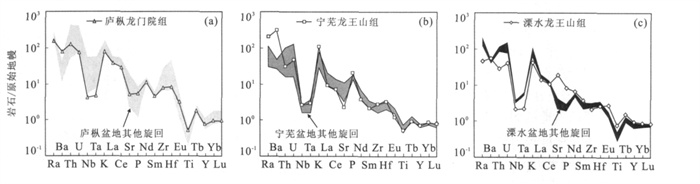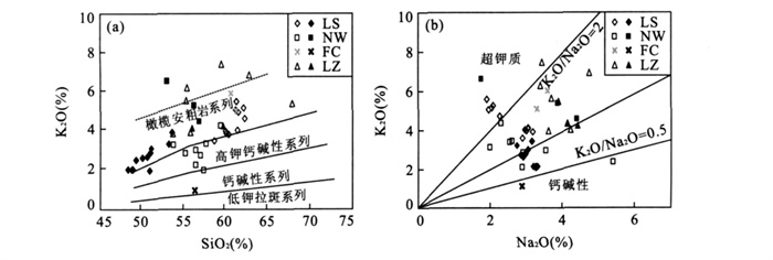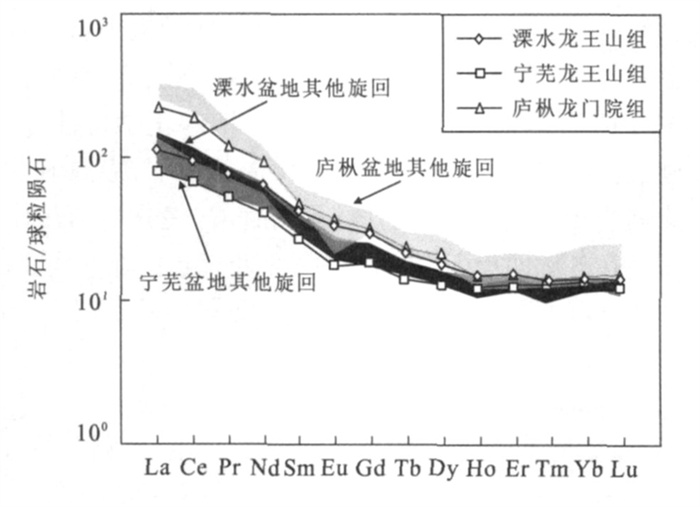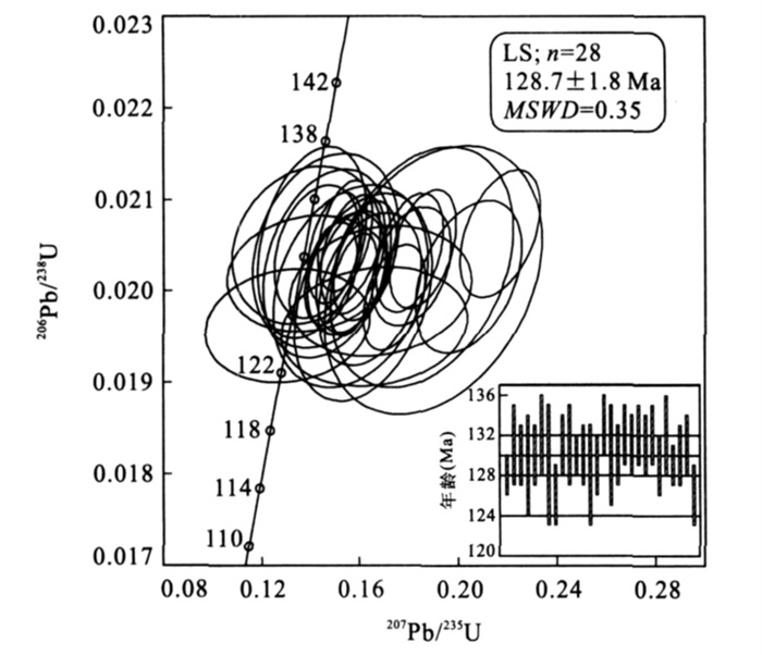 图 1 长江中下游地区晚中生代火山岩盆地分布示意图(据倪若水等, 1998修改) Fig. 1. Sketch map showing distributions of Late Mesozoic volcanic basins in the middle-lower Yangtze area 图 2 溧水盆地地质简图(a) (据常州幅①1∶20万地质图修改); (b) 为溧水盆地中生代火山岩岩性柱状图(据江苏省及上海市区域地质志, 1984); (c) 为采样剖面图 Fig. 2. Geological sketch map of the Lishui basin 图 5 长江中下游地区白垩纪各火山岩盆地火山岩年龄分布图 图中溧水盆地火山岩年龄128 Ma来自本文; 其他数据来源: 宁芜项目编写小组, 1978; Wang and McDongau, 1980; 中科院地质研究所火山岩组, 1980;胡华光等, 1982; 李坤英, 1982; 吴利仁, 1984; McKee, 1988; 周金城等, 1994; 岳文浙等, 1999; 刘洪等, 2002; 张旗等, 2003; 楼亚儿和杜杨松, 2006 Fig. 5. Distribution diagram of the ages of Cretaceous volcanics from separated basins in the middle-lower Yangtze area 图 6 (a) 长江中下游地区白垩纪各盆地火山岩的K2O-SiO2图解(Peccerillo and Taylor, 1976); (b) K2O-Na2O图解(Turner et al., 1996) 图中实心点代表各盆地龙王山组火山岩, 空心点则为各盆地其他旋回的火山岩.数据来源: 溧水盆地据李超文等, 2004 和高晓峰等(2007); 宁芜盆地据王元龙等, 2001;繁昌盆地据常常印佛等, 1991;庐枞盆地据刘洪等, 2002 Fig. 6. Composition of Cretaceous volcanics from separated basins in the middle-lower Yangtze area plotted in K2O vs. SiO2 (a) and K2O vs. Na2O (b) variation diagram 图 7 长江中下游地区白垩纪各盆地火山岩Harker图解 数据来源: 溧水盆地据李超文等, 2004 和高晓峰等(2007); 宁芜盆地据 王元龙等, 2001 ; 繁昌盆地据常印佛等(1991); 庐枞盆地据刘洪等, 2002Fig. 7. Harker diagrams of major elements of Cretaceous volcanics from separated basins in the middle-lower Yangtze area 图 8 长江中下游地区白垩纪各盆地火山岩稀土配分曲线(球粒陨石标准值引自Taylor and McLennan (1985) 图中黑色实线代表各盆地中龙王山组(或相当于龙王山组) 火山岩, 阴影部分代表后继其他组火山岩.数据来源: 溧水盆地据李超文等, 2004 和高晓峰等(2007); 宁芜盆地据王元龙等, 2001;庐枞盆地据刘洪等, 2002 Fig. 8. Chondrite-normalized REE pattern diagram for Cretaceous volcanics from separated basins in the middle-lower Yangtze area 图 9 火山岩微量元素原始地幔归一化蛛网图解 图中(a) 庐枞盆地; (b) 宁芜盆地; (c) 溧水盆地.原始地幔标准值引自McDonough and Sun (1995); 黑色实线代表各盆地中龙王山组(或相当于龙王山组) 火山岩, 阴影部分代表后继其他组火山岩.数据来源: 溧水盆地据李超文等(2004) 和高晓峰等(2007); 宁芜盆地据 王元龙等(2001) ; 庐枞盆地据刘洪等(2002)Fig. 9. Primitive mantle-normalized trace element diagram for Cretaceous volcanics 表 1 溧水盆地龙王山组粗面岩中错石LA-ICPMS定年结果 Table 1. LA-ICPMS U-Pb data of zircons in the trachytes from the Longwangshan Formation of Lishui basin   表 2 长江中下游地区白垩纪各盆地火山岩年龄资料 Table 2. Age data of Cretaceous volcanics from separated basins in the middle-lower Yangtze area   表 3 长江中下游地区4个火山岩盆地火山岩系对比 Table 3. Comparisons of volcanic rock series from four separated basins in the middle-lower Yangtze area