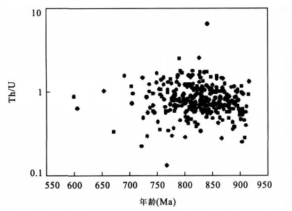 Fig.  2.  Diagram showing relationship between Th/U ratios and U-Pb ages for detrital zircons