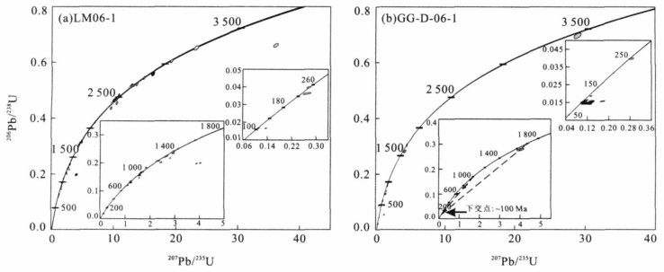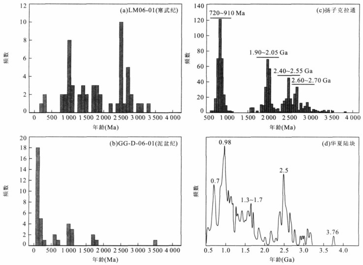 图 1 广西大瑶山-大明山隆起区区域地质图(a.据陈开礼, 2002)及其在华南(h.据li et al, 2002)和广西成矿区带中的位置(c.据陈开礼, 2002) 1.第三系; 2.白垩系; 3.石炭系; 4.泥盆系; 5.寒武系; 6.震旦系; 7.花岗闪长岩; 8.花岗岩; 9.断裂; 10.省界; 11.采样点I.桂北成矿区; II.桂中成矿区; III. 大瑶山成矿带; IV.云开成矿区; V.右江成矿区; VI. 钦州成矿带 Fig. 1. Regional geological map of Dayaoshan-Damingshan area (a. modified after Chen 2002) and sketch maps show ing locrtions of the study area in South China(b. modified after Li et al, 2002) and in Guangxi metallization zones (c. modi-fied after Chen 2002) 图 4 广西大瑶山寒武纪(a)和泥盆纪(b)碎屑锆石U-Pb谐和年龄频数直方图及其与扬子(c.据Liu et al.2006)和华夏陆块(d.据于津海等, 2006)对比 Fig. 4. Concordia age histograms of detrital zircons from the Cambrian (a) and Devonian (b) strata in eastern Guangxi and their comparisons with those of the Yangtze craton (c. Liu et al., 2008) and Cathaysian block (d. Yu et al., 2006) 表 1 广西大瑶山寒武纪(LM06-1)和泥盆纪(GG-D-06-1)砂岩锆石U-Pb同位素组成及表面年龄 Table 1. U-Pb isotopic compositions and their apparent ages of detrital zircons from the Cambrian (LM06-1) and Devonian (GG-D-06-1) sandstones in Dayaoshan area of easterm Guangxi