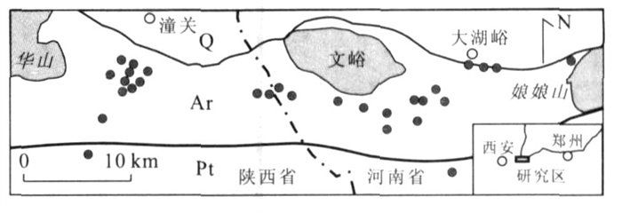 实心圆.金矿; Q.第四系; Pt.元古界蓟县系; Ar.太华群.华山、文峪和娘娘山花岗岩为埃达克岩, 金矿赋存于古老变质岩系中, 但其成因与埃达克岩有关