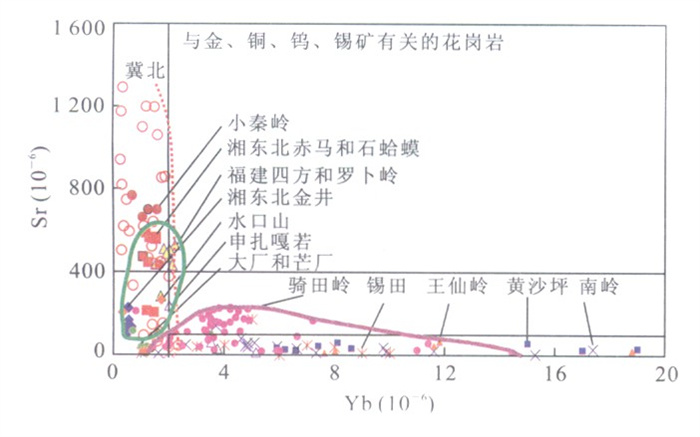图 3 与金、铜、钨、锡有关的花岗岩的Sr-Yb图