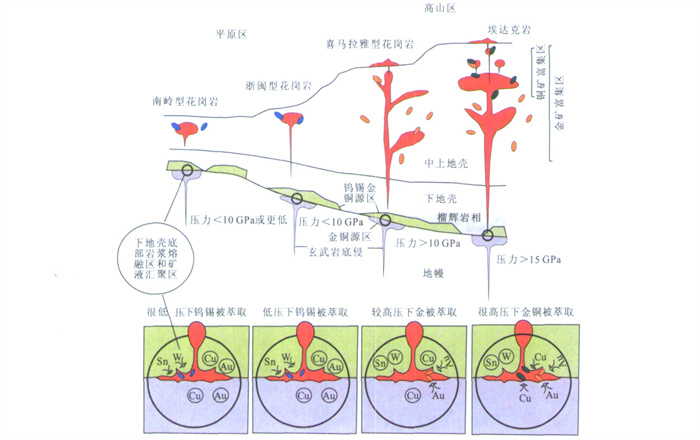图中主要说明不同类型的花岗岩和不同类型成矿的深度不同: 埃达克岩形成的深度最深, 有利于金铜的萃取; 喜马拉雅型花岗岩形成的深度较深, 有利于金的萃取; 南岭型花岗岩形成的深度最浅, 有利于钨锡的萃取.图中假定岩浆和矿液的萃取是在下地壳底部发生的, 钨锡主要来自下地壳, 金铜既可来自下地壳, 也可来自底侵的玄武岩