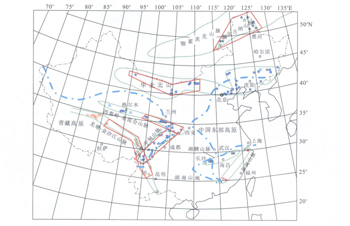 星号.埃达克岩(实心-侵入岩; 空心-喷出岩), 不同时代的埃达克岩用颜色予以区分: 蓝色.三叠纪-早侏罗世; 绿色.侏罗纪; 红色.白垩纪; 黄色.第三纪; 实心方块.喜马拉雅型; 蓝色粗点线示高原; 绿色粗虚线示山脉; 红色粗实线示今后找矿的重点区.湖南山地范围内花岗岩的分布见图 6.本图未表示中国东部高原和青藏高原范围内埃达克岩和喜马拉雅型花岗岩的分布, 详见张旗等(2008c, 2008d)