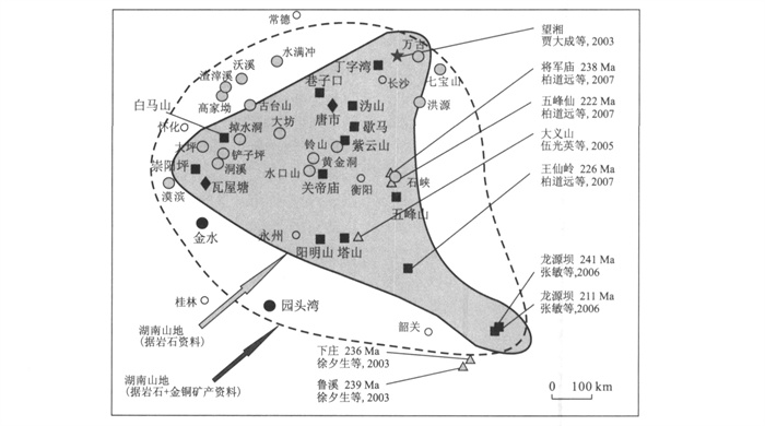 实心方块.喜马拉雅型花岗岩; 五角星.埃达克岩; 菱形.浙闽型花岗岩; 三角形.南岭型花岗岩; 阴影实心圆.金矿; 黑色实心圆.铜矿; 实线.以岩石资料圈定的湖南山地范围; 虚线.以岩石和金铜矿床资料重新圈定的湖南山地范围.岩石资料据贾大成等, 2003; 徐夕生等, 203;伍光英等, 2005; 王岳军等, 2005, 2007;张敏等, 2006;柏道远等, 2007;Wanget al 2006., .矿床资料据彭渤和黄瑞华, 1996; 康如华等, 2001; 李福顺等, 2002; 赵建光等, 2004; 方向阳等, 2005; 谢新泉和张衡龙, 2005