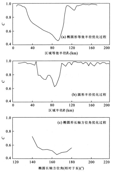 摘要: 为研究大震前地震空间相关长度的变化特征, 分析了青藏块体东北缘6次中强地震前的地震活动的时空演变.在计算空间相关长度过程中, 采用长轴与孕震区主要断裂走向一致的椭圆形空间窗, 并设计了优化程序.比较椭圆形和圆形空间窗的结果, 表明对所研究的6次中强地震前都观测到了增长的地震空间相关长度.椭圆形空间窗的结果比圆形的结果更好, 相关长度增长幅度较大, 曲率参数值较小.利用3种合成地震目录对结果进行了显著性检验.3种随机数据的检验结果都否定了零假设, 表明观察到的模型不是由随机数据干扰造成的, 这一观点的置信水平被证实为99%以上.最后得出主震震级与临界区的尺度(等效半径)关系为logRe~0.46(±0.02)M, 与理论值符合得较好.Abstract: For studying the characteristics of seismic correlation length before great earthquakes, the temporal-spatial change of seismicity prior to 6 moderate strong earthquakes (ML>5. 5) in the boundaries along the northeast margin of Tibet block have been analyzed. We use ellipse, whose long axis is coincident with the strike of main fault belt in the source area, as the spatial window to analyze growing correlation length prior to main-shock and design the corresponding optimization procedure. Comparison between the results from elliptical and circular spatial windows shows that the growing correlation length prior to 6 moderate strong earthquakes studied have been observed in both two spatial windows. The results from ellipse are better than that from circular, and the growth ranges of correlation length in former are larger than those in later yet the smaller curvature parameter values of C are obtained in elliptical spatial windows. Three types of random synthetic catalog are used to test the significance of the results. The results reject the null hypothesis for three types of random synthetic catalog and show that the observed patterns are not consequences of random fluctuations. That theory is found to be of above 99% confidence levels. The scaling relation we found, log Re~0.46 M between the main-shock magnitude M and the equivalent radius Re of the critical region is in good agreement with theoretical values.
