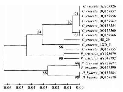 摘要: 鬣狗科动物曾是一个数量十分可观的群体, 在5百万年前曾达到演化的鼎盛时期, 留下已鉴定化石种100余种.现生的鬣狗科动物仅有4种, 仅分布在亚洲和非洲部分地区.由于该科动物演化至今种类剧减、分布区退缩, 部分化石种与现生种的谱系演化关系尚不明确, 因此成为古生物学家和进化生物学家关注的生物类群之一.采用现代分子生物学方法, 提取扩增河北秦皇岛灵仙洞中鬣狗类化石的线粒体基因组古DNA片段, 通过与基因库中已有鬣狗科动物各属种同源序列的对比分析, 从分子水平确定该化石为斑鬣狗化石; 基于古DNA序列数据构建的系统进化树显示, 该地的斑鬣狗个体与我国东北地区及俄罗斯的化石斑鬣狗具有较近的亲缘关系, 而与西欧洞穴鬣狗及非洲现生斑鬣狗亲缘关系较远, 显示出斑鬣狗演化的分子地理谱系.Abstract: The extant hyena species are the remnants of a formerly diverse group of Hyaenidae, which reached its peak about 5 MYA and contained more than 100 fossil species. Hyenas have been the subject of a number of evolutionary and systematic studies during the last two centuries, due in large part to the dramatical loss of its diversity and geography. The phylogenetic studies incorporating both morphological and molecular analysis have yielded different conclusions regarding the evolutionary relationship between extant and extinct hyenas. In this study, partial ancient DNA sequence of cytochrome b gene in mitochondrial genome was successfully retrieved from Pleistocene hyena bones collected from Hebei Province in North China. The BLAST result shows that the cracked specimen is the teeth of a spotted hyena (Crocuta crocuta), which makes the classification of the specimen clear at the molecular level. Furthermore, both the obtained sequence and the homologous sequences extracted from GenBank were aligned and used as datasets for phylogenetic analyses. The phylogenetic tree shows that the two individuals from China and the one from Russia were joined together, appearing as a sister group of the branch combined by the west European fossils and the African extant hyenas, which suggests a phylogeographic pattern of the Pleistocene cave hyenas.