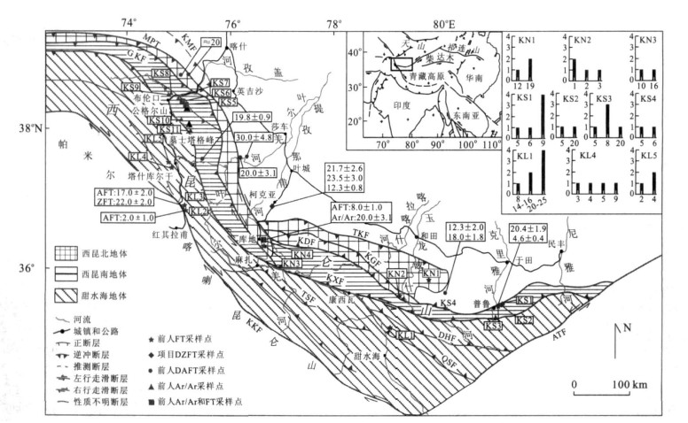 KN、KS、KL分表表示西昆北地体、西昆南地体和甜水海地体的样品分布频数图, 频数图的横坐标单位均为Ma, 纵坐标单位均为个, 矩形方框内的年龄单位为Ma.AFT (apatite fission track) 表示磷灰石裂变径迹; ZFT (zircon fission track) 表示锆石裂变径迹; DAFT (detrital apatite fission track) 表示碎屑磷灰石裂变径迹; DAFT (detrital zircon fission track) 表示碎屑锆石裂变径迹; 碎屑磷灰石和锆石的裂变径迹年龄取最年轻组分的峰值年龄, 单位为Ma, Ar/Ar表示40Ar/39Ar测年.TKF.铁克里克断裂; MPT.主帕米尔逆冲断层; GKF.盖孜西-库地南断裂; KMF.库姆塔格断裂; KGF.柯岗断裂; KXF.康西瓦断裂; DHF.大红柳滩断裂; QSF.泉水沟断裂; TSF.甜水海断裂; ATF.阿尔金断裂; KKF.喀喇昆仑断裂.热年代学数据来自Arnaud (1992)、Arnaud et al. (1993)、王军等(1999)、Cowgill (2001)、王彦斌等(2001)、万景林和王二七(2002)、王永等(2002)、Wang et al. (2003)、Robinson et al.(2004, 2007)、黎敦朋等(2007).该图据潘裕生(1990)、新疆维吾尔自治区地质矿产局(1993)、Arnaud et al. (1993)、丁道桂等(1996)、Sobel (1999) 潘桂棠等(2004)、Wang (2004)、王国灿等(2005)、刘训等(2006)、崔军文等(2006)、Valli et al. (2007)修改