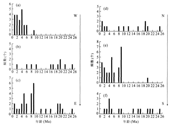 摘要: 通过总结和分析有关热年代学的资料, 认为西昆仑及邻区的隆升存在明显的时空差异性.第一, 隆升历史表现出明显的阶段性: 晚渐新世到早中新世(25~16Ma) 的部分隆升阶段、中新世中后期的快速隆升阶段(14~8Ma) 和晚中新世以来的整体强烈隆升阶段(6Ma以来).第二, 隆升在空间上显示出明显的差异性: 塔什库尔干-公格尔山地区的隆升主要集中在9Ma以来, 红其拉甫-库地地区的隆升主要集中在25~16Ma, 康西瓦-普鲁地区的隆升则主要在9Ma以来(集中在9~2Ma) 和25~12Ma.东西方向上表现为东西两端靠近构造结(喜玛拉雅西构造结和西昆仑-阿尔金构造结合部位) 的地方较新(主要在9Ma以来), 中间较老(主要在9Ma以前); 南北方向上, 西昆北地体在20Ma左右发生快速隆升, 西昆南地体在9~5Ma发生快速隆升, 而甜水海地体在5~2Ma发生快速隆升, 由北向南总体上呈现出由老到新的空间差异性.Abstract: Thermochronological data suggests that spatial-temporal differences of uplift obviously exist in West Kunlun and its adjacent area. Firstly, the uplift history falls into three distinct stages: The partial uplift stage from Late Oligocene to Early Miocene (25-16Ma), the rapid uplift stage during Middle Miocene (14-8Ma) and the holistic and strong uplift stage since Late Miocene (after 6Ma). Secondly, the uplift of the study area shows obvious spatial differences. The uplift of Kongur-Tash Gurgan area mainly occurred after 9Ma; the uplift of Hongqilapu-Kuda area mainly occurred during 25-16Ma, and the uplift of Kangxiwar-Pulu area mainly occurred after 9Ma (especially 9-2Ma) and during 25-12Ma. In the east/west direction, the uplift is earlier near the syntaxises (western Himalayan Syntaxis and West Kunlun-Altyn Syntaxis) than that in the middle area. Near the syntaxises the uplift mainly occurred after 9Ma and yet in the middle area mainly before 9Ma. In the south/north direction, the rapid uplift of northern West Kunlun terrane roughly occurred at 20Ma; the rapid uplift of southern West Kunlun terrane mainly occurred during 9-5Ma; the rapid uplift of Tianshuihai terrane mainly occurred during 5-2Ma. The rapid uplift of southern West Kunlun and its adjacent area is later than that in the north, and it varies from old to new.