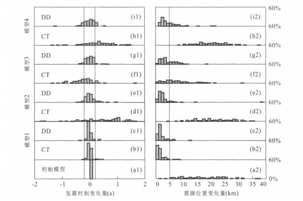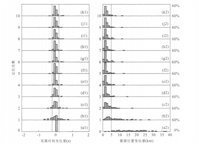 左图和右图分别表示定位后的震源相对于Enew的发震时刻和空间位置的变化, 每个柱状图中, 每条“柱”的宽度分别为0.1 s (发震时刻变化量) 和1 km (震源位置变化量), 即横坐标, 而高度则表示在每个分段内的地震个数占总数的百分比, 即纵坐标.右侧的60%表示每个子图中纵坐标的最大值, 而最小值默认为0%
