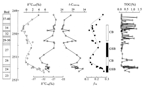 Bowring, S. A., Erwin, D. H., Jin, Y. G., et al., 1998. U/Pb zircon geochronology and tempo of the end-Permianmass extinction. Science, 280 (5366): 1039-1045. doi: 10.1126/science.280.5366.1039 Cao, C. Q., Wang, W., Jin, Y. G., 2002. Carbon isotope ex-cursions across the Permian-Triassic boundary in the Meishan section, Zhejiang Province, China. Chinese Sci-ence Bulletin, 47 (13): 1125-1129. doi: 10.1360/02tb9252 Dai, J. X., Li, J., Luo, X., et al., 2005. Alkane carbon isotop-ic composition and gas sourcein giant gas field of Ordos basin. Acta Petrolei Sinica, 26 (1): 18-26 (in Chinesewith English abstract). Gao, B., Fan, M., Liu, W. H., et al., 2005. Carbon isotopic features and genetic type of natural gas in Tahe oilfield. Oil & Gas Geology, 26 (5): 618-622 (in Chinese withEnglish abstract). Grice, K., Gao, C., Love, G. D., et al., 2005. Photic zone eu-xinia during the Permian-Triassic superanoxic event. Science, 307: 706-709. doi: 10.1126/science.1104323 Guo, Q. J., Liu, C. Q., Strauss, H., et al., 2004. Isotopic in-vestigation of Late Neoproterozoic and Early Cambrian carbon cycle on the northern Yangtze platform, South China. Acta Geoscientica Sinica, 25 (2): 151-156 (inChinese with English abstract). Haas, J., Demény, A., Hips, K., et al., 2007. Biotic and en-vironmental changes in the Permian-Triassic boundary interval recorded on a western Tethyan ramp in the Bükk Mts., Hungary. Global and Planetary Change, 55 (1-3): 136-154. doi: 10.1016/j.gloplacha.2006.06.010 Hayes, J. M., Strauss, H., Kauf man, A. J., 1999. The abun-dance of 13C in marine organic matter and isotopic frac-tionation in the global biogeochemical cycle of carbon during the past 800 Ma. Chemical Geology, 161 (1-3): 103-125. doi: 10.1016/S0009-2541(99)00083-2 Huang, X. Y., Jiao, D., Lu, L. Q., et al., 2007. The fluctua-ting environment associated with the episodic biotic cri-sis during the Permian-Triassic transition: Evidence from microbial biomarkers in Changxing, Zhejiang Prov-ice. Science in China (Series D), 50: 1052-1059. doi: 10.1007/s11430-007-0024-x Krull, E. S., Lehrmann, D. J., Druke, D., et al., 2004. Stable carbon isotope stratigraphy across the Permian-Triassicboundary in shallow marine carbonate platforms, Nan-panjiang basin, South China. Palaeogeography, Palaeo-climatology, Palaeoecology, 204 (3-4): 297-315. doi: 10.1016/S0031-0182(03)00732-6 Kump, L. R., 1991. Interpreting carbon-isotope excursions: Strangelove oceans. Geology, 19 (4): 299-302. doi: 10.1130/0091-7613(1991)019<0299:ICIESO>2.3.CO;2 Kump, L. R., Arthur, M. A., 1999. Interpreting carbon-iso-tope excursions: Carbonates and organic matter. Chemi-cal Geology, 161 (1-3): 181-198. doi: 10.1016/S0009-2541(99)00086-8 Kump, L. P., Garrels, R. M., 1986. Modeling at mospheric O2 in the global sedimentary redor cycle. Am. J. Sci. , 286: 337-360. doi: 10.2475/ajs.286.5.337 Li, Y. C., Zhou, Z. Z., 2002. Massive dissociation of gas hy-drate during oceanic anoxia as a cause of mass extinc-tion at the end Permian. Geology Geochemistry, 30: 57-63 (in Chinese with English abstract). Magaritz, M., Baer, R., Baud, A., et al., 1988. The carbon-iso-tope shift at the Permian/Triassic boundary in the southern Alps is gradual. Nature, 331 (6154): 337-339. doi: 10.1038/331337a0 Magaritz, M., Krishnamurthy, R. V., Holser, W. T., 1992. Parallel trends in organic and inorganic carbon isotopes across the Permian/Triassic boundary. American Jour-nal of Science, 292 (10): 727-739. doi: 10.2475/ajs.292.10.727 McCrea, J. M., 1950. The isotopic chemistry of carbonates and a paleotemperature scale. The Journal of Chemical Physics, 18: 849-857. doi: 10.1063/1.1747785 Payne, J. L., Lehrmann, D. J., Wei, J. Y., et al., 2004. Large perturbations of the carbon cycle during recovery from the end-Permian extinction. Science, 305 (5683): 506-509. doi: 10.1126/science.1097023 Riccardi, A., Kump, L. R., Arthur, M. A., et al., 2007. Car-bon isotopic evidence for chemocline upward excursions during the end-Permian event. Palaeogeography, Palaeoclimatology, Palaeoecology, 248 (1-2): 73-81. doi: 10.1016/j.palaeo.2006.11.010 Shi, Y. Z., Hu, C. Y., Fang, N. Q., et al., 2004. Carbon iso-topic composition of organic matter in Co-rich ferro-manganese crust and its implication for paleoceanogra-phy. Earth Science—Journal of China University of Geosciences, 29 (2): 148-150 (in Chinese with Englishabstract). Smith, R. M. H., MacLeod, K. G., 1994. Sedimentology and carbonisotope stratigraphy across the Permian-Triassic boundary in the Karoo basin, South Africa. Journal of African Earth Sciences, 27: 185-186. Tenger, Liu, W. H., Xu, Y. C., et al., 2004. Organic carbonisotope record in marine sediment andits environmental significance—An example from Ordos basin, NW Chi-na. Petroleum Exploration and Development, 31 (5): 11-16 (in Chinese with English abstract). Tenger, Liu, W. H., Xu, Y. C., et al., 2006. Comprehensive geochemical identification of highly evolved marine car-bonate rocks as hydrocarbon-source rocks as exempli-fied by the Ordos basin. Science in China (Series D), 49 (4): 384-396. doi: 10.1007/s11430-006-0384-7 Voigt, S., Andrew, S. G., Voigt, T., 2006. Sea-level change, car-bon cycling and palaeocli mate during the Late Cenomanian of northwest Europe: An integrated palaeoenvironmental analysis. Cretaceous Research, 27 (6): 836-858. doi: 10.1016/j.cretres.2006.04.005 Wang, C. J., Liu, Y. M., Liu, H. X., et al., 2005. Geochemi-cal significance of the relative enrichment of Pristaneand the negative excursion of δ13CPr across the Permian-Triassic Boundary at Meishan, China. Chinese Science Bulletin, 50 (19): 2213-2225. doi: 10.1007/BF03182673 Xie, S. C., Pancost, R. D., Huang, J. H., et al., 2007a. Adouble carbon isotope perturbation during the Permo/Triassic crisis. Geology, in press. Xie, S. C., Pancost, R. D., Huang, X. Y., et al., 2007b. Mo-lecular and isotopic evidence for episodic environmental change across the Permo/Triassic boundary at Meishanin South China. Global and