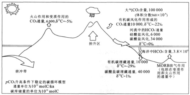 图 1 煤山B剖面δ13Corg、δ13Ccarb、forg及TOC随时间变化曲线(年代据Bowring et al., 1998) CB.蓝细菌繁盛; GSB.绿硫细菌繁盛 Fig. 1. The variation trends of δ13Corg, δ13Ccarb and TOC at Meishan Section B 图 3 Kump and Arthur (1999)提出的碳同位素循环模式 Fig. 3. The carbon cycle model proposed by Kump and Arthur (1999) 表 1 煤山B剖面样品δ13Corg及δ13Ccarb分析结果 Table 1. The δ13Corg and the δ13Ccarb data of the samples analyzed at Meishan section B   表 2 一些层位的有机碳埋藏分数forg、原始生产力P和总有机碳含量TOC Table 2. The fraction of the organic carbon burial (forg), the primary production (P) and the TOC content in some beds in Meishan section B
