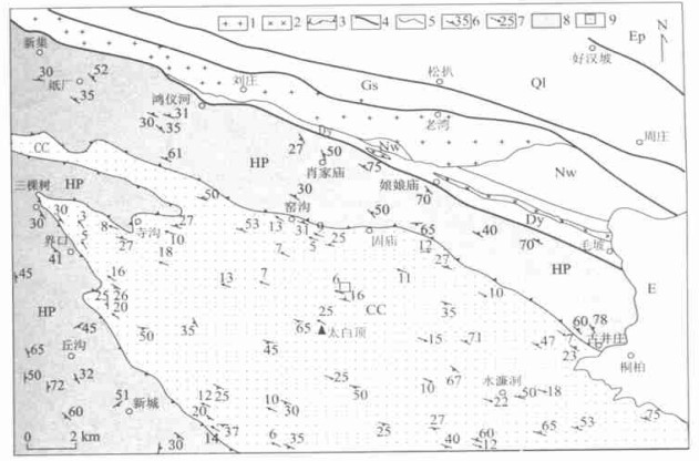 1.晚中生代花岗岩; 2.晚古生代辉长岩; 3.下、中复合拆离带; 4.构造边界; 5.地质界线; 6.区域面理; 7.拉伸线理; 8.高压变质单位(HP); 9.核部杂岩单位(CC); Ql.秦岭岩群; Gs.龟山岩组; Nw.南湾岩组; Dy.定远岩组; E.第三系