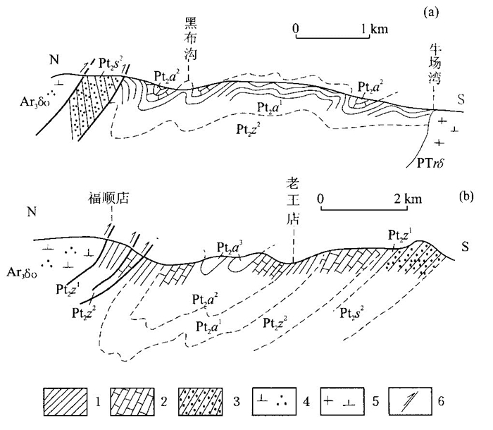 a.福顺店以西; b.福顺店以东.1.板岩; 2.灰岩、白云岩; 3.石英岩、石英砂岩; 4.石英闪长岩; 5.花岗闪长岩; 6.逆冲断层.其他图例同图 1